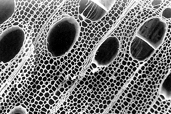炭の表面を拡大すると、目に見えない無数の小さな穴(多孔質構造)が開いています。 その表面積は、わずか1gでテニスコート1面分以上とも言われるほど。